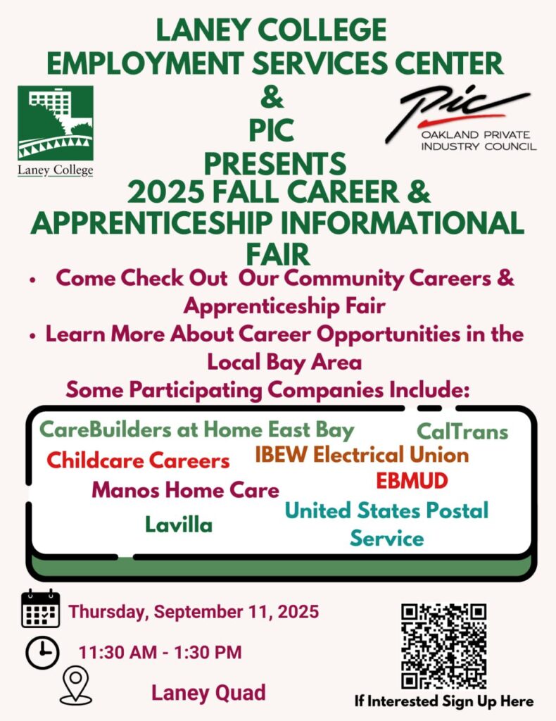 Don’t miss out on the 2025 Fall Career & Apprenticeship Informational Fair hosted by Laney College Employment Services Center & PIC!