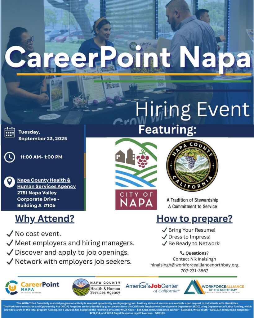 Looking for your next career opportunity in local government? County of Napa & City of Napa are Hiring! Join us to learn about their option positions at our September Hiring Event: