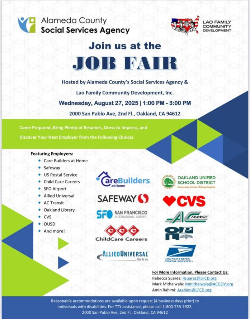 Alameda County Social Services Agency and the Lao Family Community Development, Inc. are hosting a Job Fair on Wednesday, August 27, 2025, from 1:00 PM to 3:00 PM.