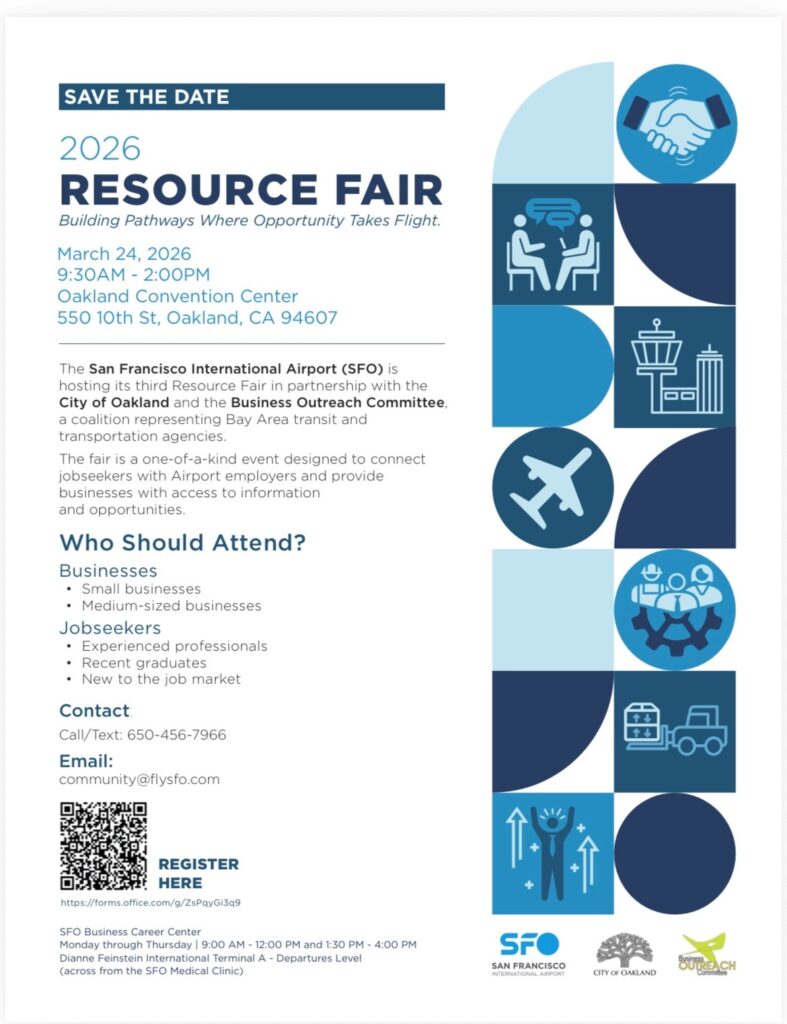 The San Francisco International Airport (SFO) is hosting its third Resource Fair in partnership with the City of Oakland and the Business Outreach Committee, a coalition representing Bay Area transit and transportation agencies. The fair is a one-of-a-kind event designed to connect jobseekers with Airport employers and provide businesses with access to information and opportunities. Whether you are an experienced professional, a recent graduate, new to the job market, a small business, or a medium-sized business, this fair has something for you.