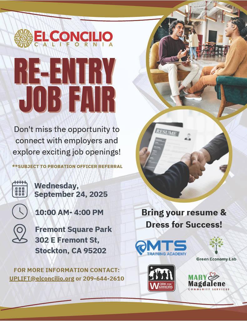 El Concilio is hosting a Re-Entry Job Fair on Wednesday, September 24, 2025 from 10 AM – 4 PM at Fremont Square Park in Stockton.