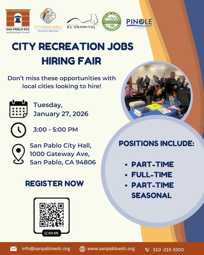 San Pablo EDC is excited to kick off our hiring fairs by connecting the community with local employers. Start 2026 strong by joining us for the City Recreation Jobs Hiring Fair, the first hiring event of the year.