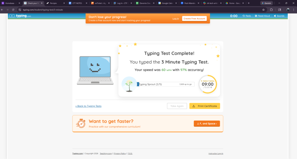 Today, I completed touch typing tests and took the Independent Challenge, scoring a 19 — my highest score yet! I also achieved my fastest typing speed of 60 words per minute. Overall, today has been an amazing day! :))
